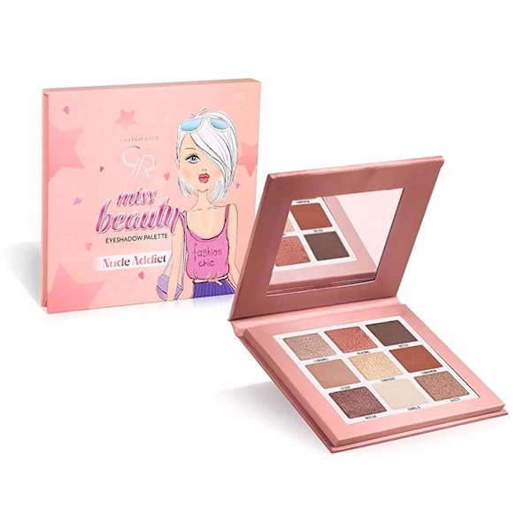 پالت سایه چشم میس بیوتی Nude Addict گلدن رز شامل ۹ سایه چشم در طیف رنگهای Nude (رنگهای ملایم) است و برای یک آرایش روزانه گزینه بسیار عالی محسوب میشود. رنگبندی این پالت بسیار زیبا و در اولین نگاه چشمها را به خودش جذب میکند. سایههای این پالت به صورت فشرده تولید شدهاند و شامل رنگهای نود، قهوهای و بژ است. این پالت سایه چشم دارای ۵ سایه مرواریدی و ۴ سایه مات است.